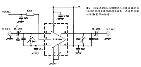 其开放集极输出给你在增益与频宽之间作出折衷,以50Ω负荷而言,它提供15dB增益及400MHZ频宽,以1KΩ为负荷时,增益则提升至4.5dB,但频宽却降低至25MHz。只要该元件对50Ω系统做到恰当的调谐或者匹配,是可以为系统带来增益的。SL6140电路可用作用一个高频、调谐式AGC放大器,特点是频宽窄、增益高,正如AN45应用注解中所指示,输入与输出级在与50Ω系统达至调谐及匹配下,该电路可于100MHz信号上提供35dB功率增益——图7。